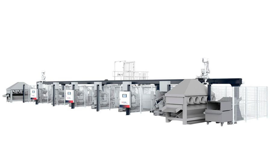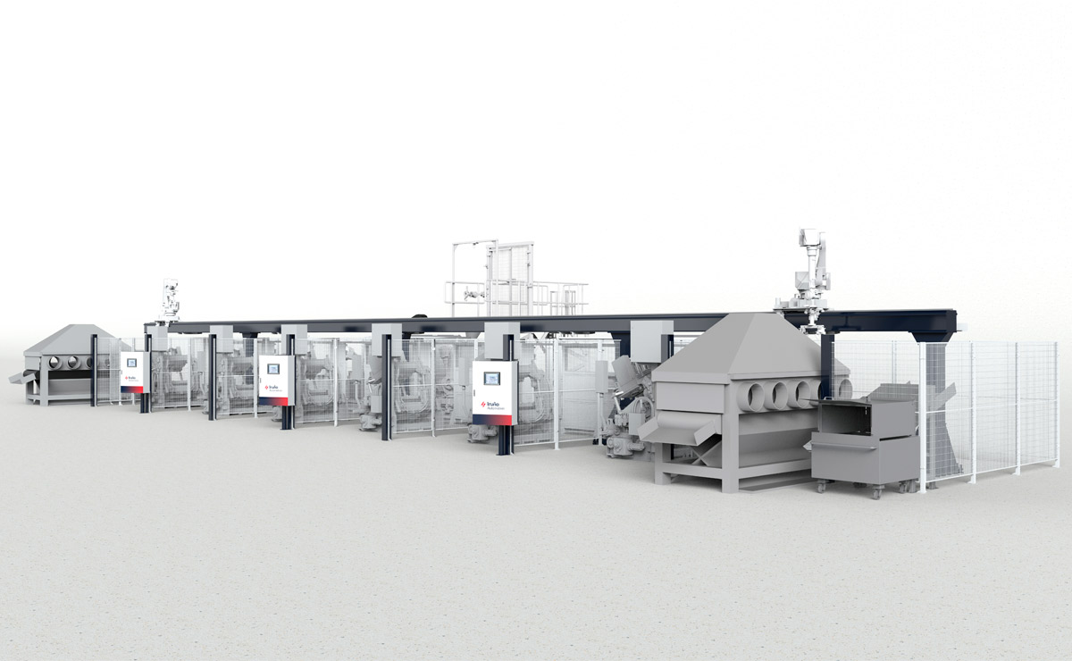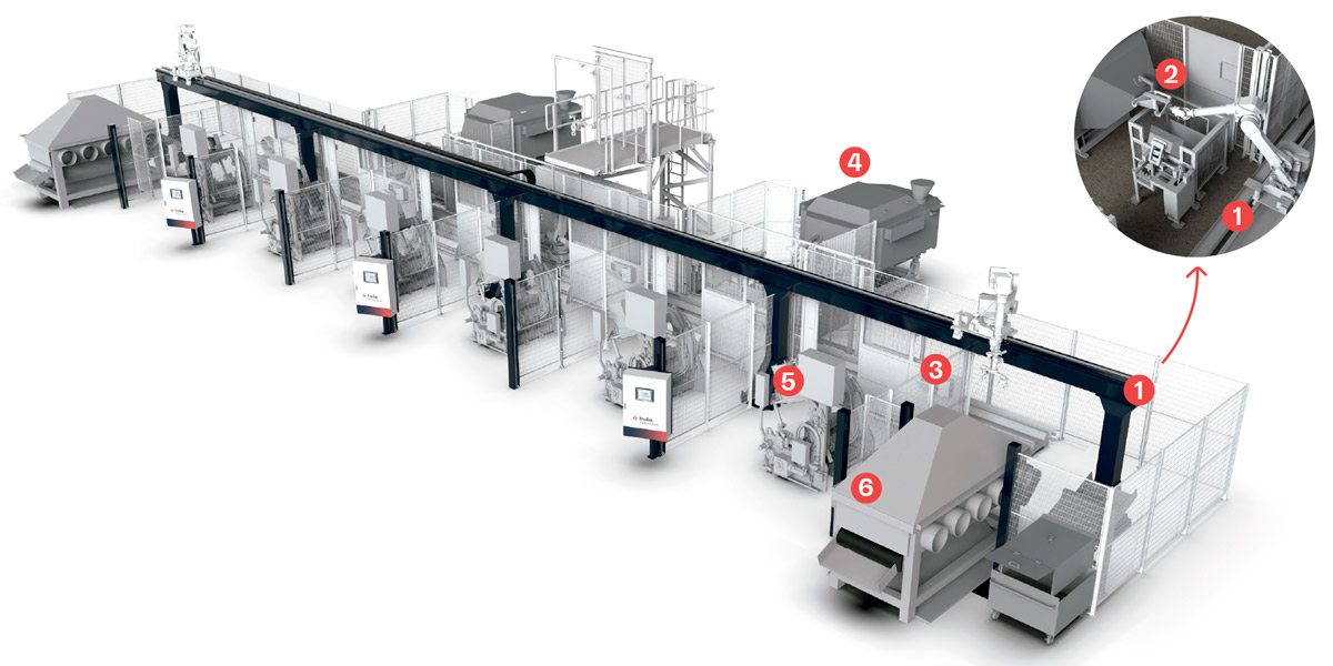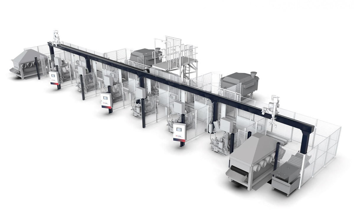 Combined and modular solutions for robot management in aluminum casting processes. The system integrates robots mounted on linear systems both on the floor and on gantries, ensuring precise control of cycle times, optimal accessibility to all workstations, and enhanced plant safety. Thanks to its modular and scalable design, this solution can easily adapt to different plant configurations and sizes, allowing the addition or relocation of robots and linear systems as production needs grow or processes change.