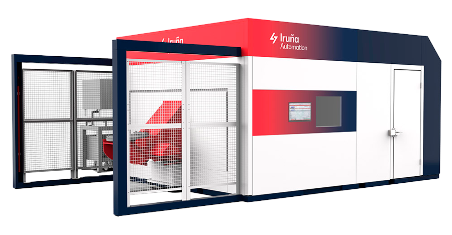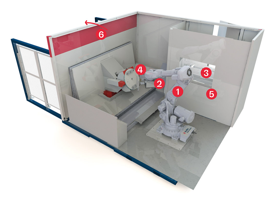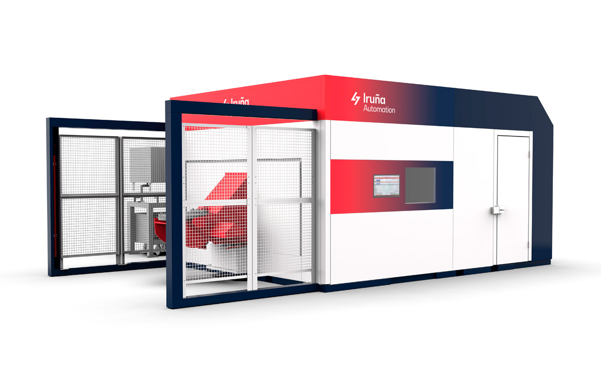 B finishing cell uses a double manipulator for part loading, where a robot with a multipurpose spindle performs cutting and machining operations directly onto the parts. The coordinated movement between the manipulator and the robot ensures a smooth workflow, minimizing cycle times and maximizing production. Equipped with a quick-change system that allows agile and efficient replacement of tools during the machining process. Additionally, it features an integrated tool magazine containing a variety of different tools, making easy the automation and optimization of multiple operations, minimizing the need of manual intervention.