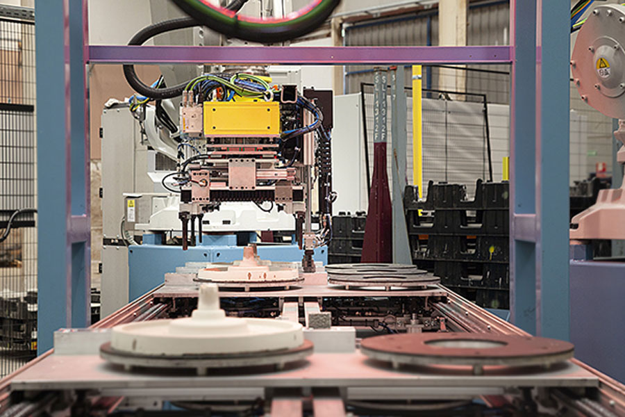 Handling and unloading of triggers, painting, drilling, loading into molding machines, and disc quality control.
